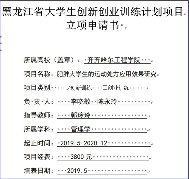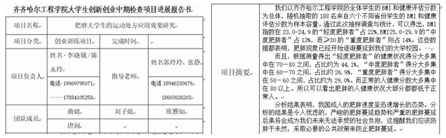 (一)将真实“大创”项目引入课程。将真实的黑龙江省大学生创新创业训练计划项目《肥胖大学生的运动处方应用效果研究》引入课程,带领学生在真实项目中真学、真做,达到掌握真本领的学习效果。