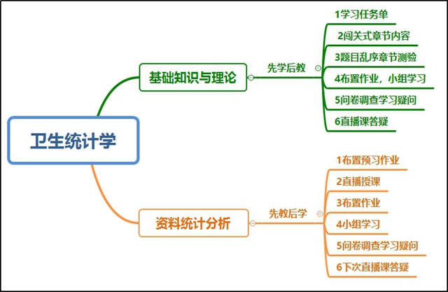 (一)课程实施流程。根据课程内容的难度和特点,分为两个模块进行。第一模块是基础知识与理论,介绍卫生统计学共性的基础知识和基础理论,采用先学后教的方式。第二模块是资料统计分析,介绍变量资料统计分析统计方法的应用与表达,采用先教后学的方式。