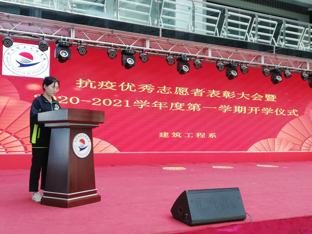 9月13日,建筑工程系在科技园三楼学生活动中心举行抗疫优秀志愿者表彰大会暨2020-2021学年度第一学期开学仪式。