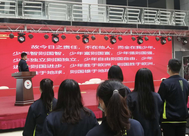 开学式最后,系学生会主席唐忠兴带领全体同学现场诵读《少年中国说》,宣示刻苦读书、深入实践、拼搏进取的决心。