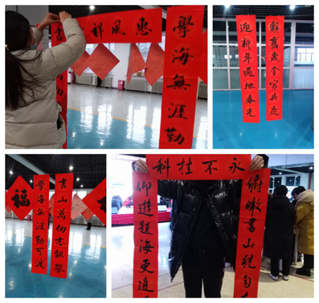12月28日16点,刚刚结束期末考试的部分师生,戴着口罩,笑眯眯地走进学生活动中心,他们手持精心设计的“领取春联一副”免费券进入现场,所见所闻尽是温馨与祥和,几张桌子间隔数米距离排列有序,纸墨笔砚早已备齐,有书法专长的人士正凝神挥毫,大屏幕上播放着与新年祝福相关的喜庆画面,上空则盘旋着民乐弹奏的古典乐曲……前来的师生们排队等待着领取这份暖暖的馈赠。