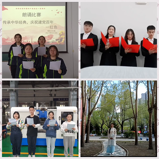 本次朗诵比赛,参赛团队借助身边的校园环境,完成个性化的参赛作品。有的学生参赛朗诵作品的背景画面是专业机床实训场地,“不忘初心、牢记使命”的背景墙,更多的以教室“中而至庸 和而不同”校训等为背景衬托进行朗诵。