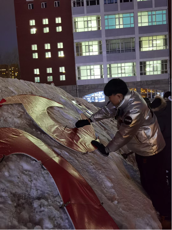 下午,老师和学生分成两组进行雪景制作,将已经做好的字体与雪堆结合,用树枝和铁丝将两者进行固定后,倒水冰冻,同学们的手套被水浸透,手指冻得冰凉僵硬,但寒冷的天气没有阻挡同学们制作热情。在老师指导下,同学们分工明确、相互配合默契,经过老师们和同学们的共同努力,完成了明德广场东西两侧雪景制作。