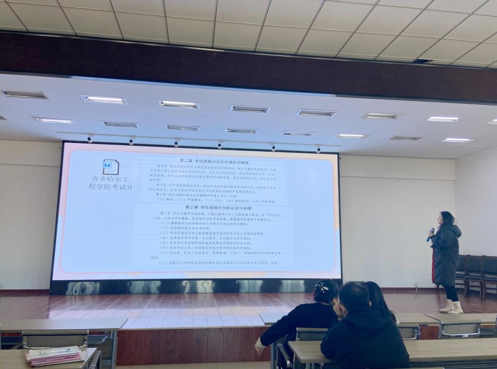 信息工程系兰天月老师向学生讲述了校园违规行为及纪律处分规章制度,告诫学生们在接下来的考试中要认真对待、严谨求实、诚实守信、绝不舞弊,坚定自己的信念,做一名讲诚信的人。