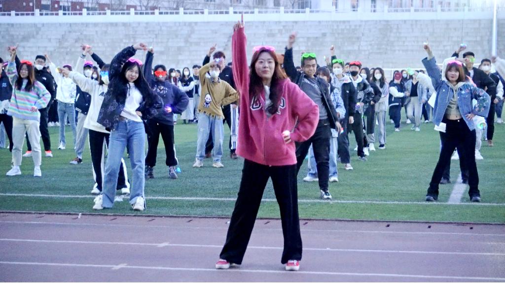 活动在一首欢快的《日不落》歌曲中拉开了帷幕。舞艺工坊的学生在前排,动作娴熟地领舞,他们身后,百余名学生分散站位,充满青春活力的身影遍布操场,吸引许多学生观看并加入广场舞大军之中。