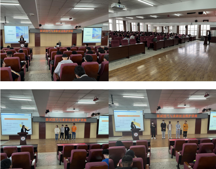 讲座主要围绕:如何认识自己、大学学习与就业、职业与职业选择、大学学习与职业、就业还是继续读书等问题。王老师通过“就业”的主题及“心态”“能力”这两个核心进行叙述。讲座中,王老师利用视频展现了往届成功就业的学生的求职经验,面试技巧,并通过分组提问形式,了解学生的求职打算,让学生知道了自身在模拟求职中存在不足和就业协议、劳动合同签订流程。