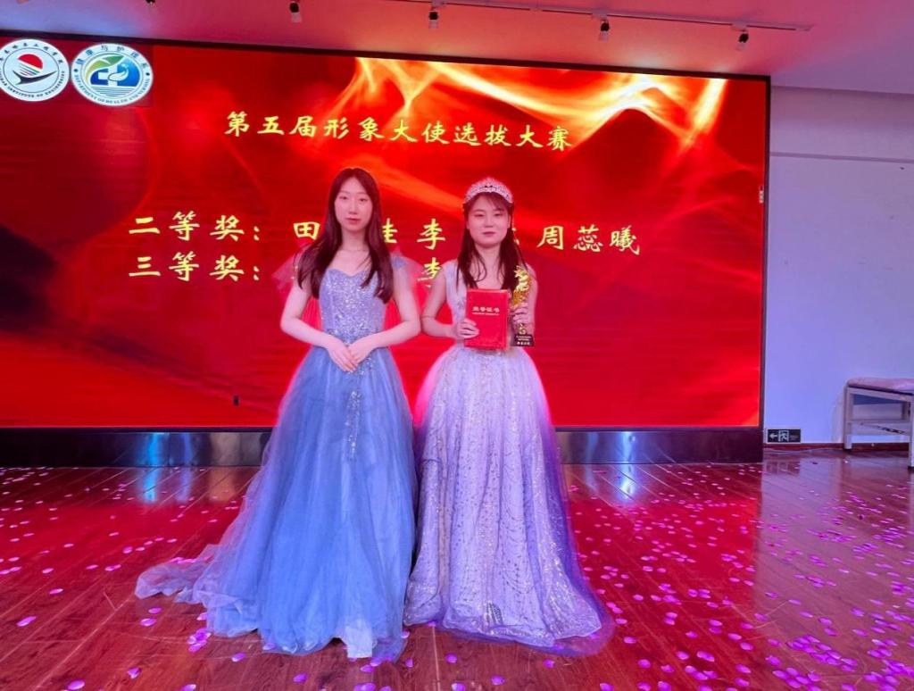 王雪、刘雨鸥两位同学进行了形象大使交接仪式,王雪同学将代表着形象大使信物的天使皇冠传递到了刘雨鸥同学的手中。
