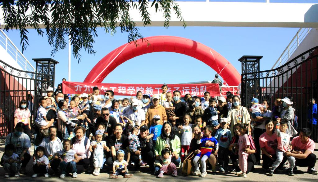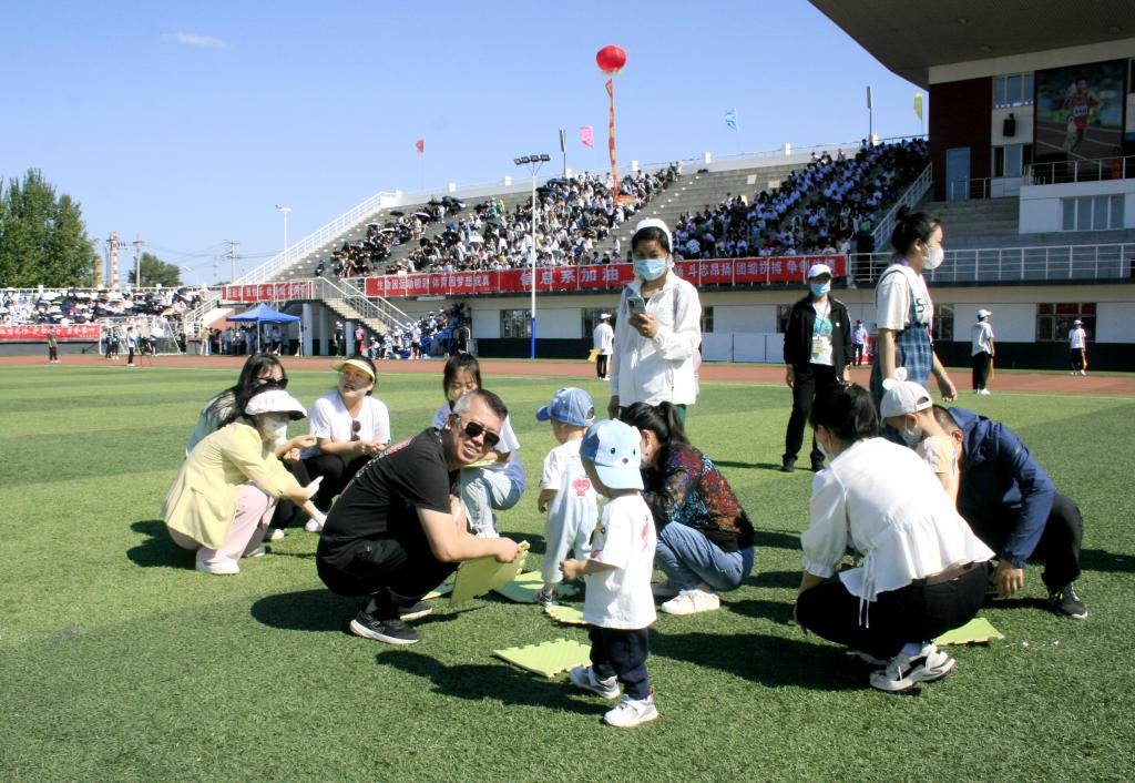 秋风吹叶易湖边,艳阳高照运动场。9月16日,在学校的体育场上彩旗招展,欢声又笑语,2022年秋季田径运动会召开了。特别引人注目的是一支平均年龄4岁近40名的小朋友运动员,他们拉着“教工子弟运动队”的横幅,随着音乐,在家长的陪伴下,大手拉小手欢快地走向运动场中央,参加“比赛”。