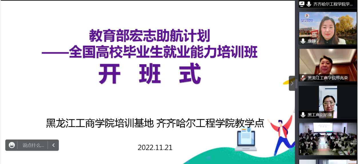 宏志助航计划就业能力培训基地代表、黑龙江工商学院校长助理邢兆荣在线阐述了“宏志助航计划”的宗旨与意义,并对培训班提出了具体要求。