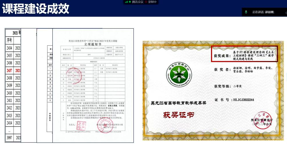 郝丽娜的报告呈现了依托学校的“四真三化(FT)”课程建设模式,郝老师报告中介绍了学校教学改革理念:课点是由态度点、知识点、技能点“三元素”,通过具有互涵关系的数量、质量、序量,单个点或多个点组合而成的课程的基本单位。课点具有独立性和不确定性。介绍了课点的时空观:课点在时间上,体现为课点的序量;在空间上,体现为具有互涵关系的数量、质量、序量的三维组合。并应用于《土木工程材料》课程开发与形成的课程开发成果,就土木工程材料课程教学改革与课题研究和申报进行讲解。郝丽娜老师通过三个问题开启报告,介绍了FT课程建设模式在《土木工程材料》课程中的应用,展示了课程的一级矩阵、二级矩阵、三级矩阵,分享了思政元素挖掘的流程:专业思政目标→课程思政目标→项目思政目标→课点思政目标→态度点。以课点:混凝土配合比设计为例介绍了通过矩阵图法将专业核心素养融入知识体系,形成课程态度目标,落实到课点,分解为态度点、知识点、技能点,通过课点的实施与评价,保障课程育人成效。