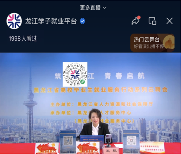 12月15日,人事处参加了“黑龙江省高校毕业生就业服务行动系列云聘会”活动。此次活动是省人才服务中心(省就业服务中心)主办,并依托“龙江学子就业平台”微信视频号,搭建企业和求职人员在线对接通道,以“直播带岗”的形式开展,直播期间在线观看3500余人次,点赞量达5.8万次。