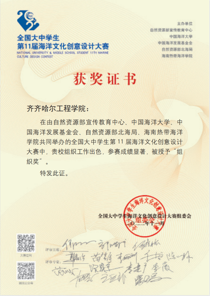 近日,我校学子在第十一届海洋文化创意大赛中获佳绩。学校被授予优秀组织奖,信息工程系视觉传达设计专业2020级黄晓蓉等21位同学获得佳作奖。