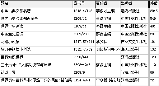 《中国古典文学名著》外借2045次,该文学名著为系列读物,多年来持续首位;《世界历史必读知识全书》和《世界全史速读》列第二位和第三位,借阅量分别是549次和491次。根据图书借阅数据综合分析:榜单中有1/2是索书号为K的历史、地理类图书,有2/5是中国戏剧出版社蔡磊主编的系列丛书,说明读者对历史、地理类及系列丛书阅览需求极高。有三本是文学类图书,已连续三年上榜,可以看出读者对文学类图书由衷热爱,阅读热度持续增长。索书号为Z类的综合性图书《百科知识世界》三年来持续在榜,今年名次有所下滑,值得关注的是,本年度索书号为E的军事类图书《三十六计:名人成功决策与计谋》跃进第七名,且借阅数超过一百,近五年内为首次,可见随着时代的发展读者对军事类图书开始关注。通过阅读先贤的智慧决策与计谋来学习谋篇布局,因各系专业对学生课外读物都有一定的建议,每期图书荐读也有不同的主题,学生购书学校报销的政策也给广大读者更多自主选择的方向,有助于阅读目的性与自我素质提升相结合,展现了以学生为中心的基本理念。