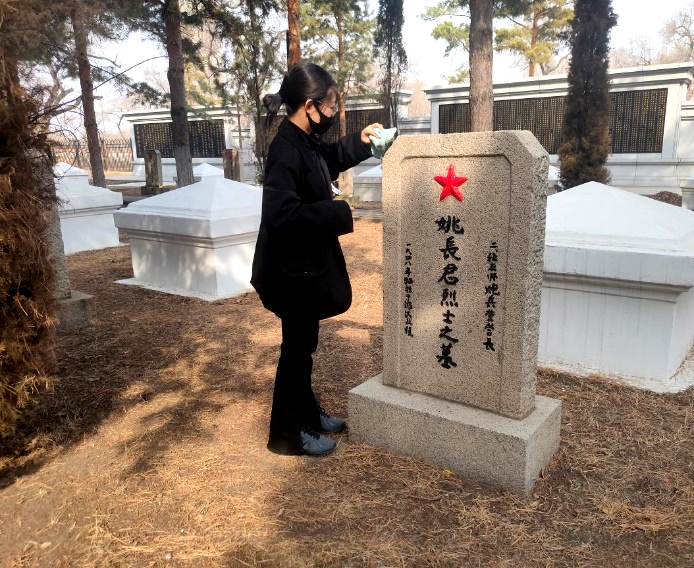 到达西满革命烈士陵园后,动画专业学生先为烈士墓碑拭去灰尘,并对刻字及雕刻补色。
