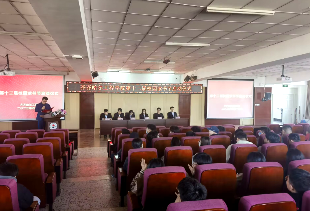 4月13日下午,学校第十二届校园读书节启动仪式在图书馆501报告厅举行。基础部大学语文教研室教师于丽媛、王春凤、郭磊,图文信息中心教师马爽菲、超星培训讲师李鑫竺,大学生流行音乐协会主席杨紫涵、现代书法协会会长郝欣雨、青年马克思主义协会会长林震轩、机电工程系学生会主席赵新伟、爱车之家主席牟静文、舞动奇迹社团主席吕欢欢、围棋协会会长王子文,以及各学生社团代表近200人参加。