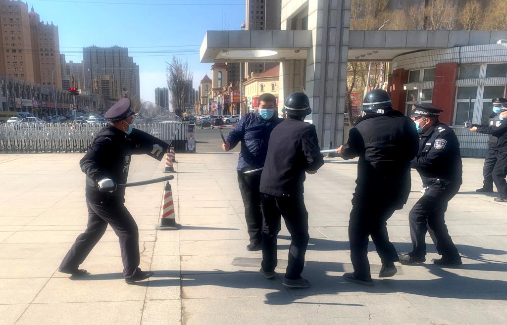 4月14日上午,保卫处处长张景文带领全体安保人员在学校南门开展反恐防暴实战演练活动。
