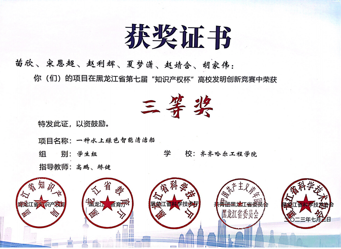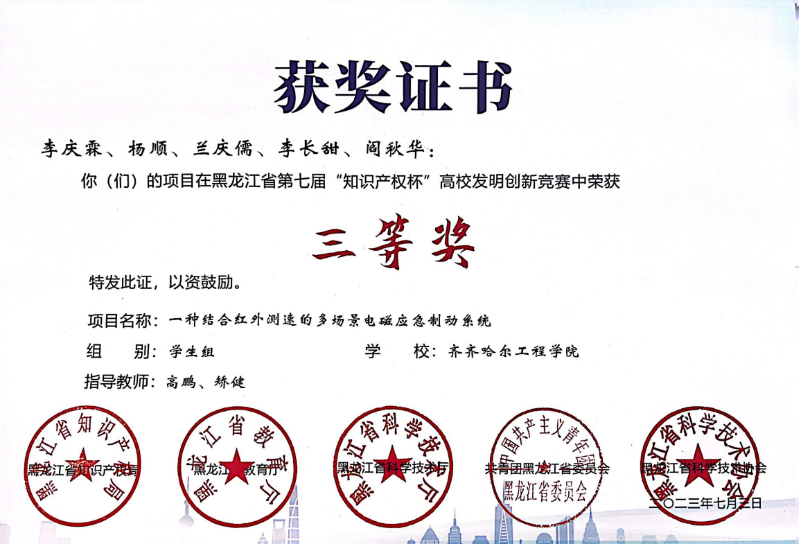 近日,黑龙江省第七届“知识产权杯”高校发明创新竞赛圆满闭幕。我校三支队伍获奖,一支获教师组三等奖,另两支获学生组三等奖。