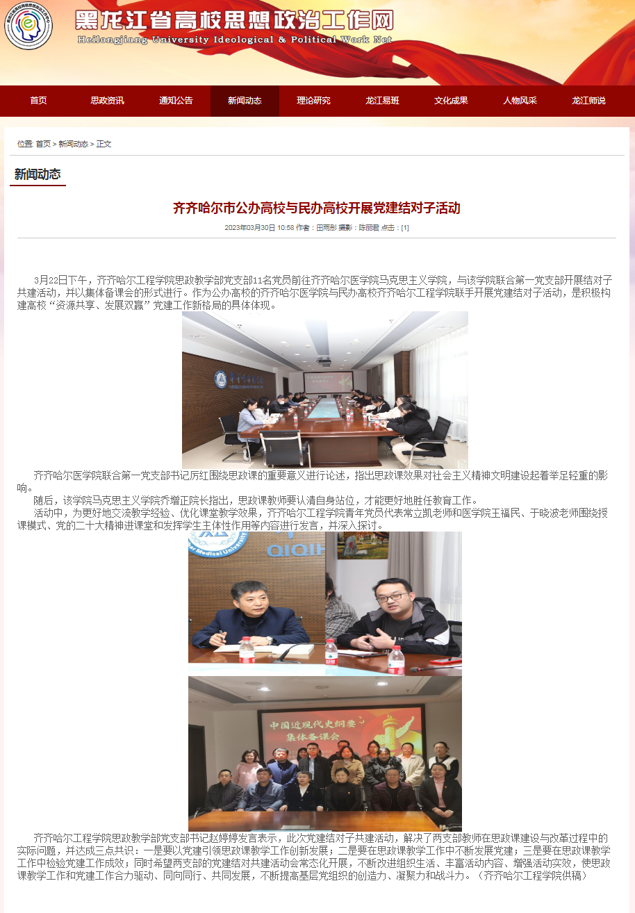 黑龙江省高校思想政治工作网:齐齐哈尔市公办高校与民办高校开展党建结对子活动