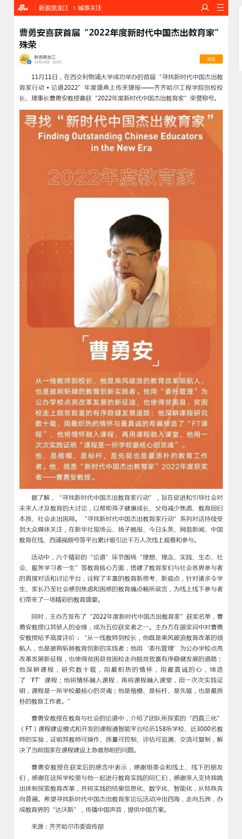 新浪黑龙江:曹勇安教授喜获首届“2022新时代中国杰出教育家”殊荣