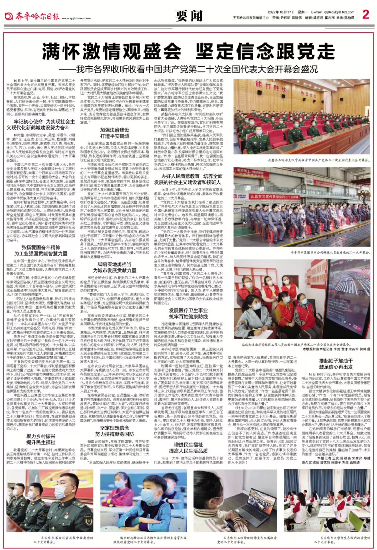 齐齐哈尔日报要闻版刊发我校学生在公寓收看党的二十大开幕会电视直播照片