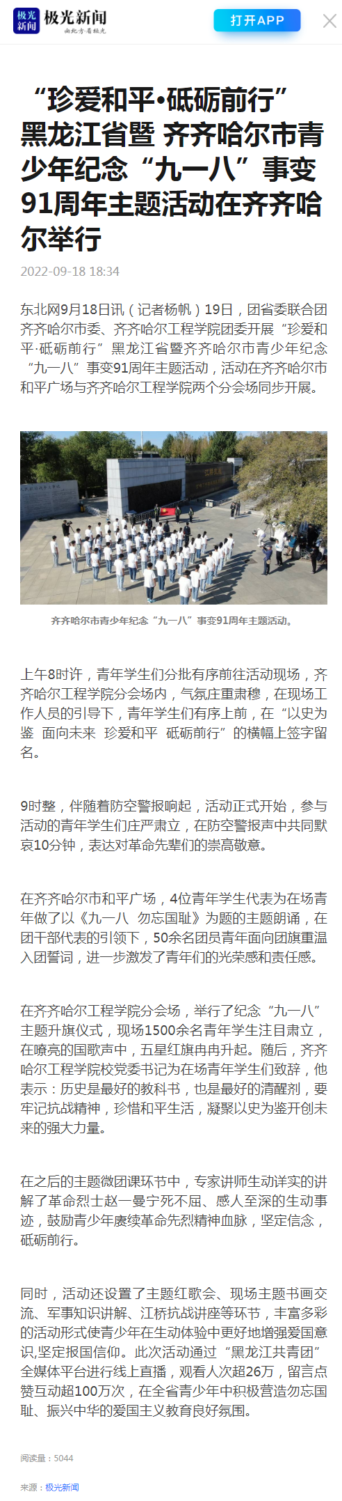 极光新闻:“珍爱和平·砥砺前行”黑龙江省暨 齐齐哈尔市青少年纪念“九一八”事变 91周年主题活动在齐齐哈尔举行
