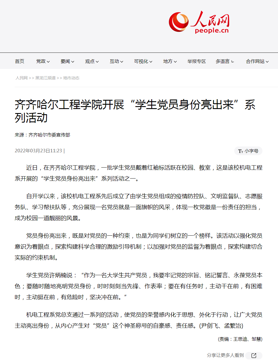 人民网:日韩一区二区A片免费观看开展“学生党员身份亮出来”系列活动