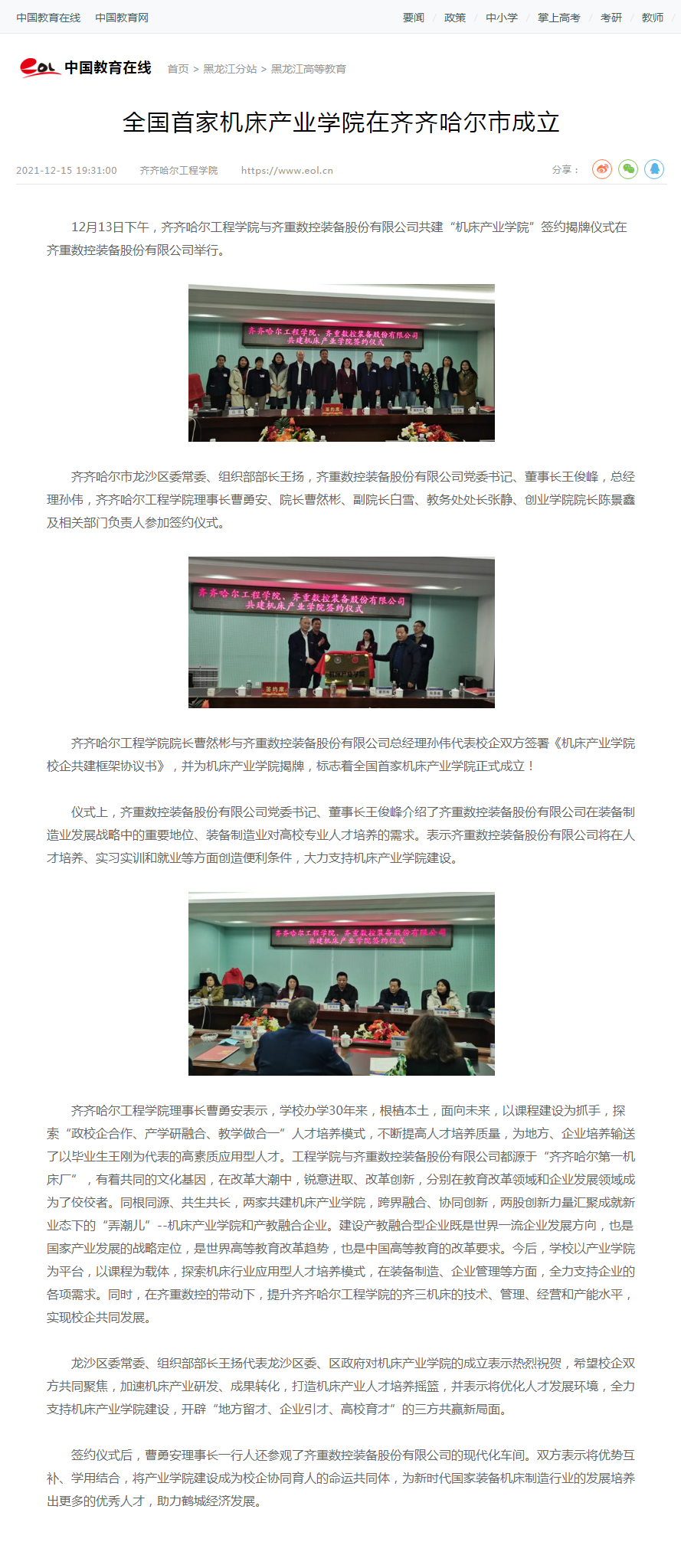 中国教育在线:全国首家机床产业学院在齐齐哈尔市成立