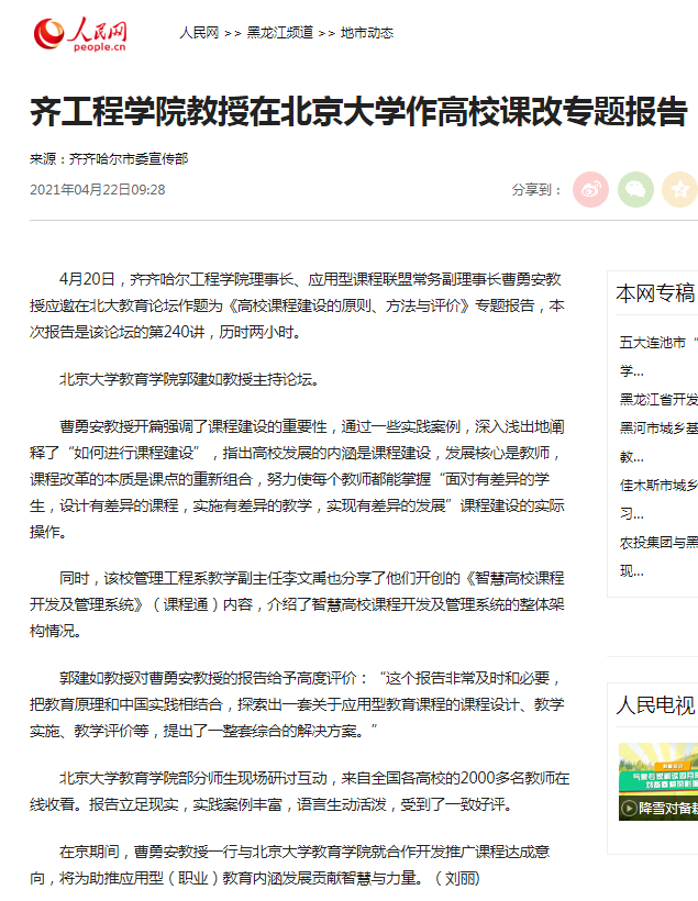 人民网:齐工程学院教授在北京大学作高校课改专题报告