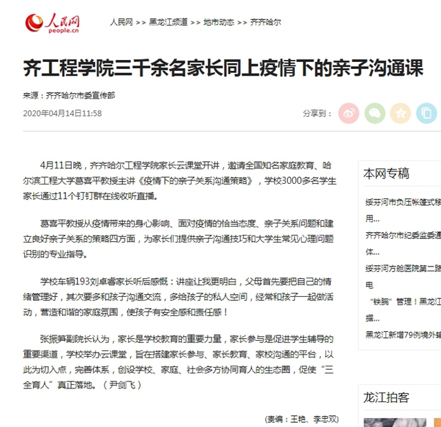 人民网:齐工程学院三千余名家长同上疫情下的亲子沟通课