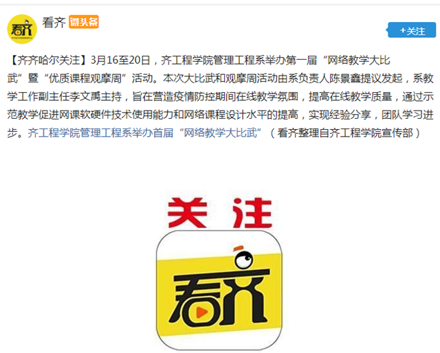 看齐微头条:齐工程学院管理工程系举办第一届“网络教学大比武”暨“优质课程观摩周”活动