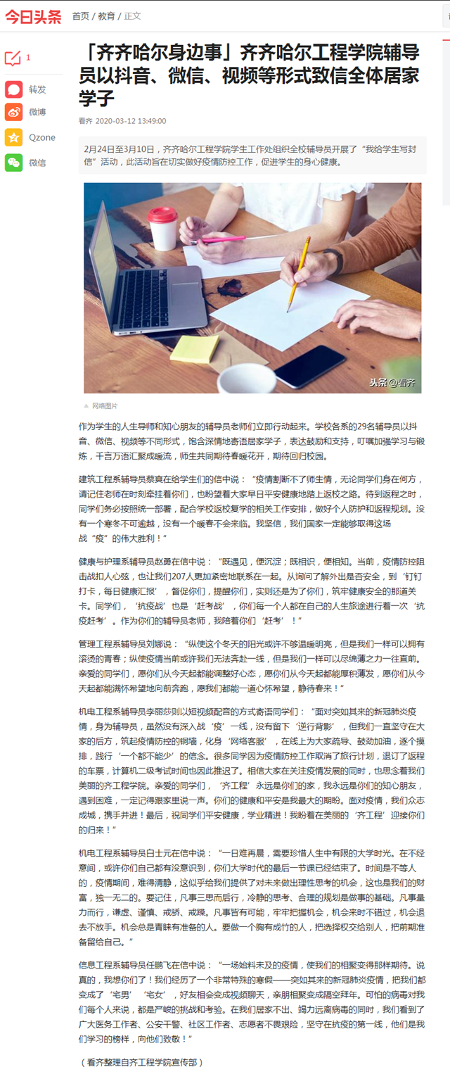 今日头条《齐齐哈尔身边事》:日韩一区二区A片免费观看辅导员以抖音、微信、视频等形式致信全体居家学子