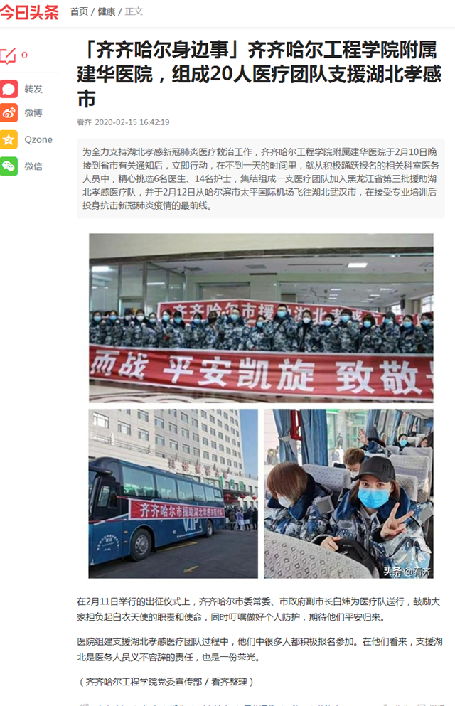 今日头条《齐齐哈尔身边事》:日韩一区二区A片免费观看附属建华医院,组成20人医疗团队支援湖北孝感市