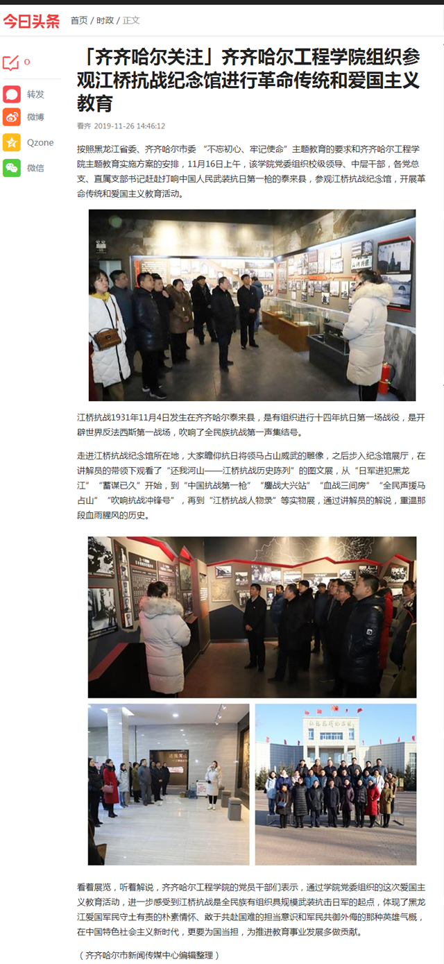 今日头条《齐齐哈尔关注》:日韩一区二区A片免费观看组织参观江桥抗战纪念馆进行革命传统和爱国主义教育