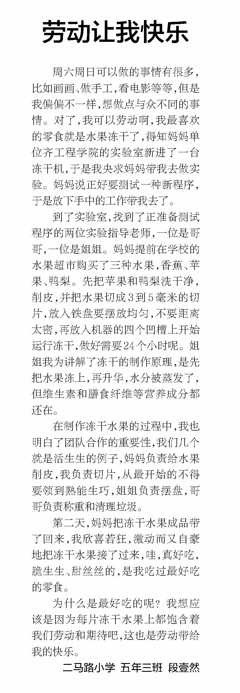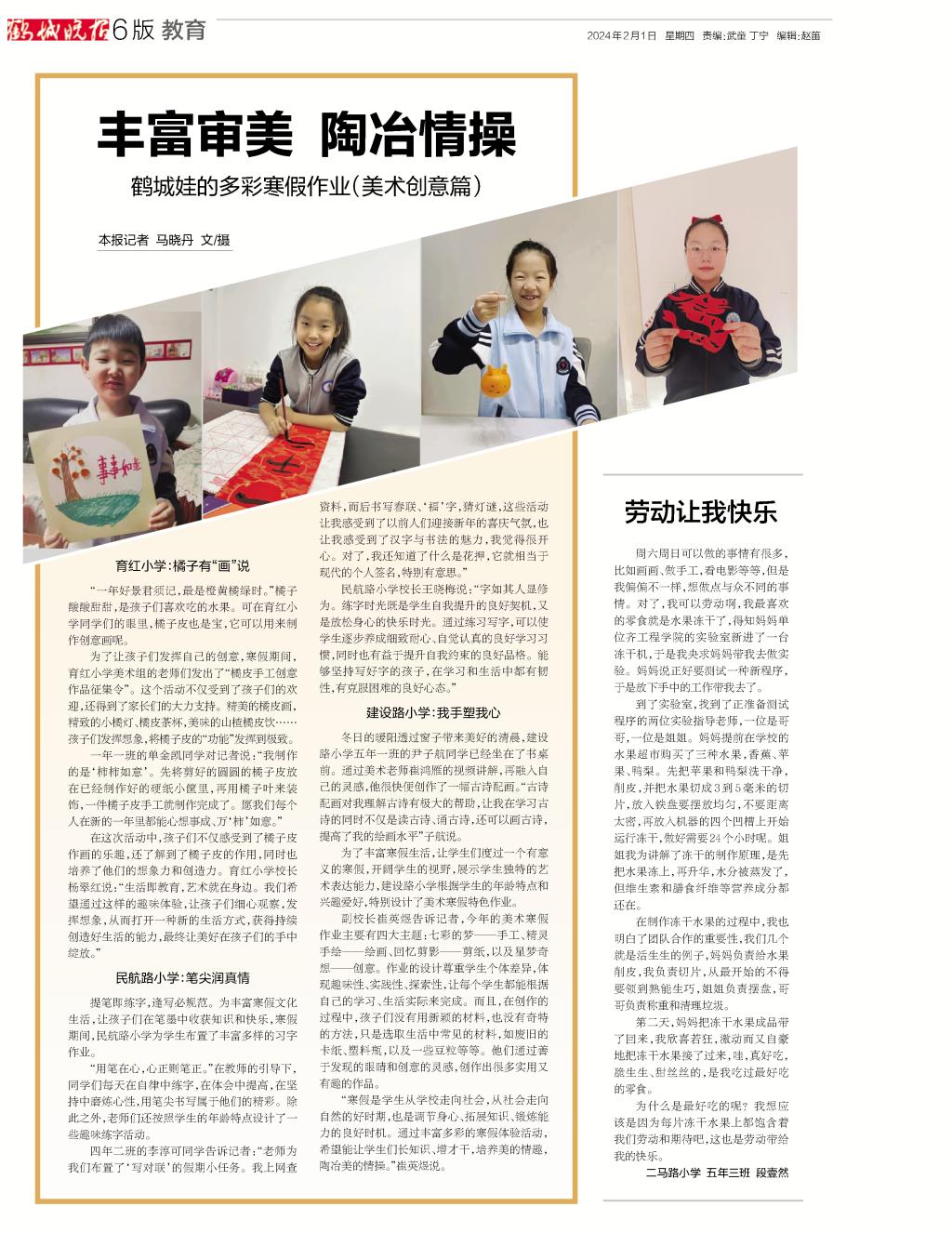 《鹤城晚报》发表子弟学校学生作文《劳动让我快乐》
