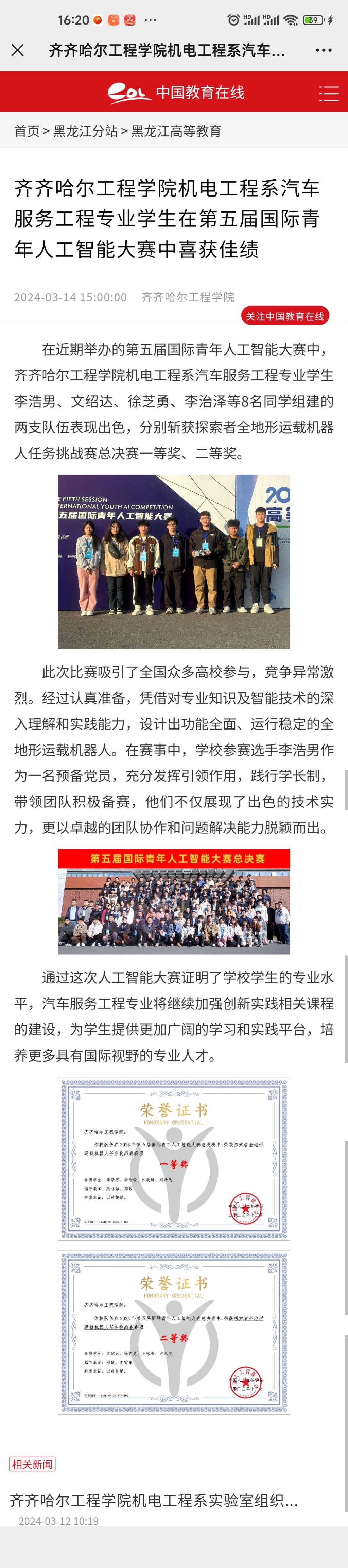 《中国教育在线》报道齐工程机电工程系汽车服务专业学生在第五届国际青年人工智能大赛中喜获佳绩