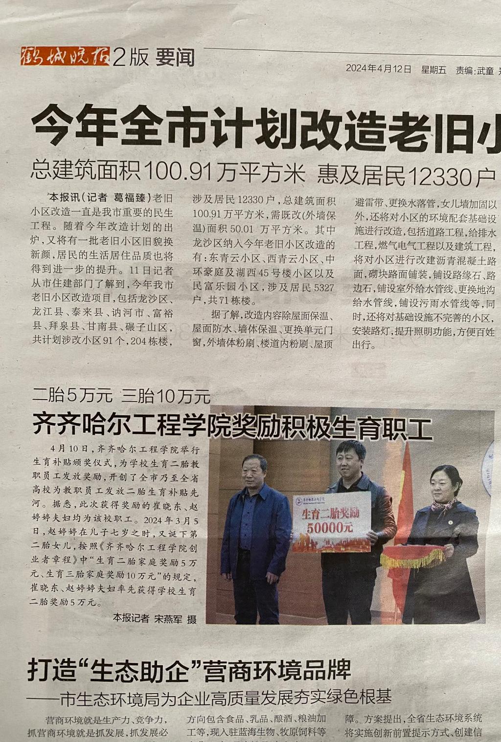 《鹤城晚报》报道日韩一区二区A片免费观看奖励积极生育职工