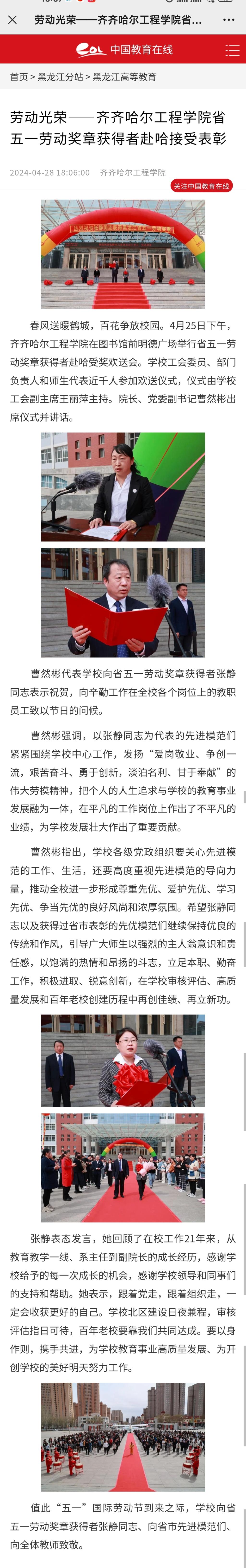 《中国教育在线》报道日韩一区二区A片免费观看省五一劳动奖章获得者张静副院长赴哈接受表彰 劳动光荣