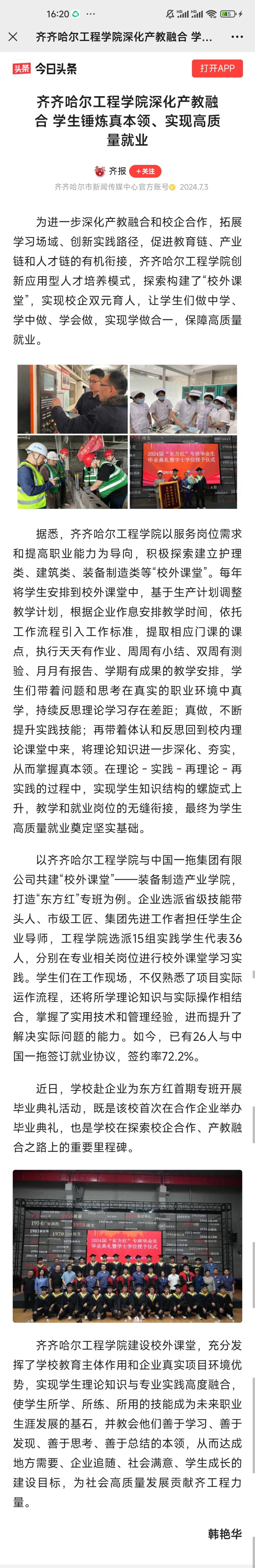 《今日头条》(齐报)报道日韩一区二区A片免费观看深化产教融合 学生锤炼真本领、实现高质量就业
