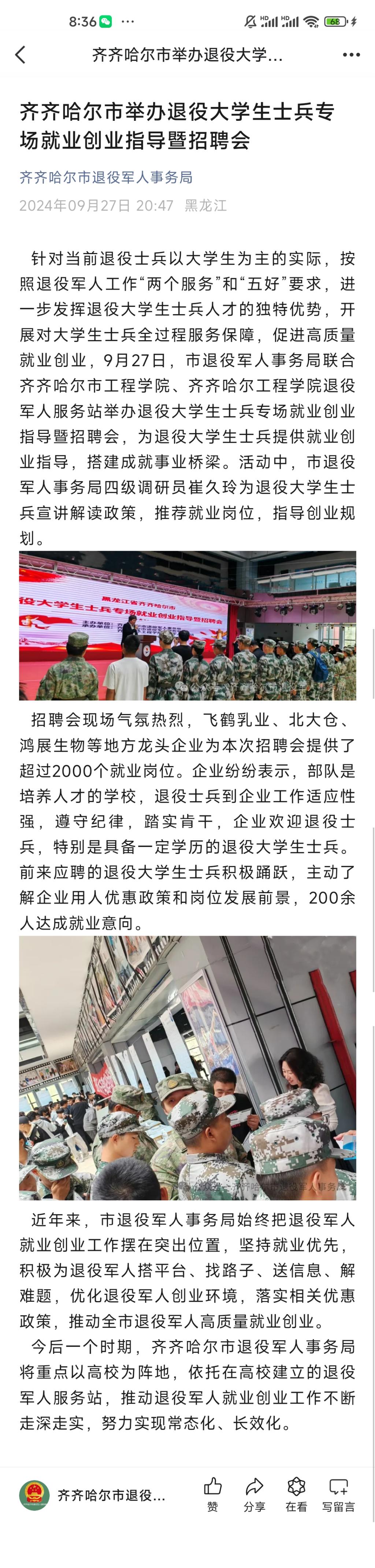 《齐齐哈尔市退役军人事务局》报道齐齐哈尔市举办退役大学生士兵专场就业创业指导暨招聘会