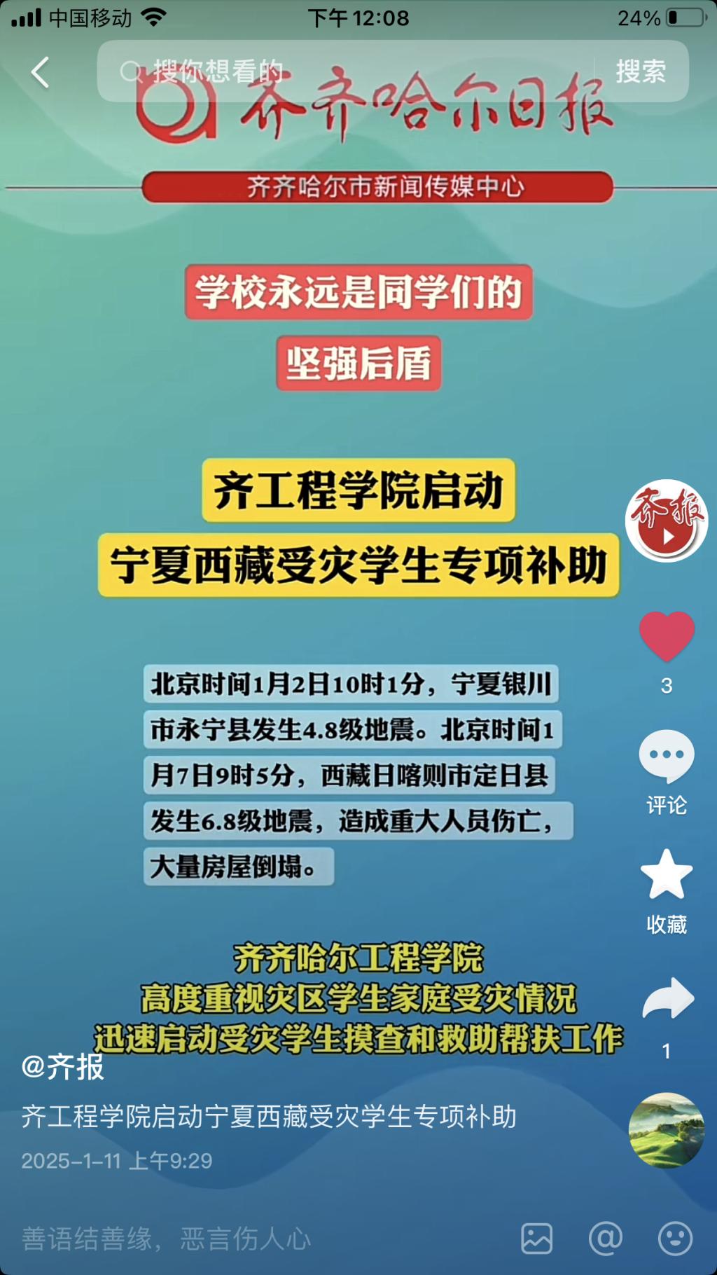 《齐报抖音》齐工程学院启动宁夏西藏受灾学生专项补助