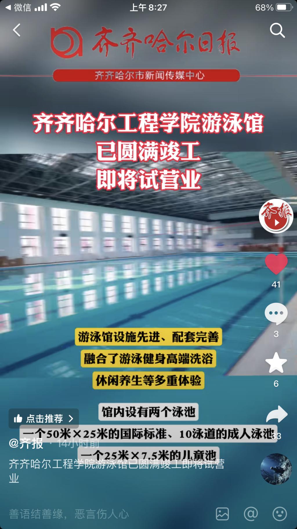 《齐齐哈尔日报》抖音:日韩一区二区A片免费观看游泳馆已圆满竣工 即将试营业