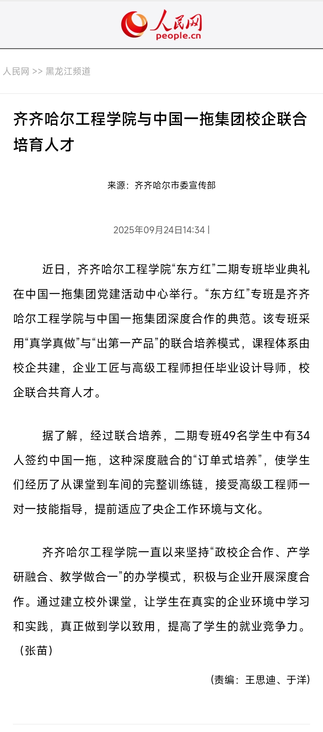 《人民网》日韩一区二区A片免费观看与中国一拖集团校企联合培育人才