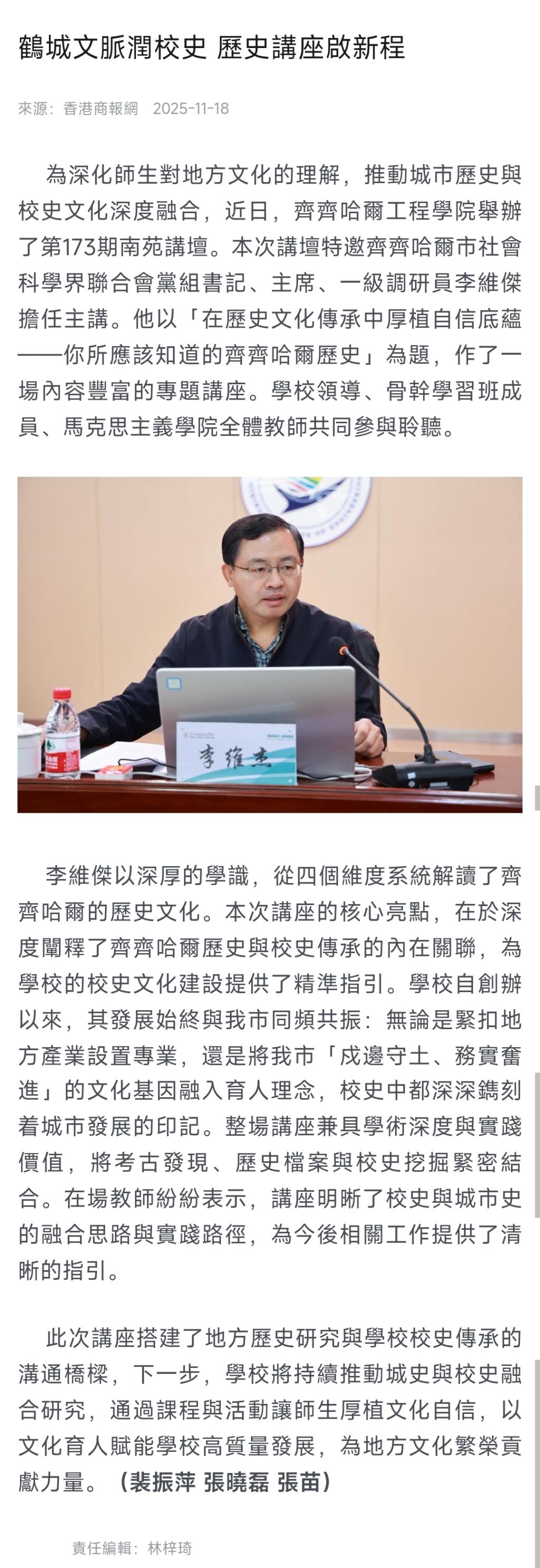 《香港商报网》鹤城文脉润校史 历史讲座启新程