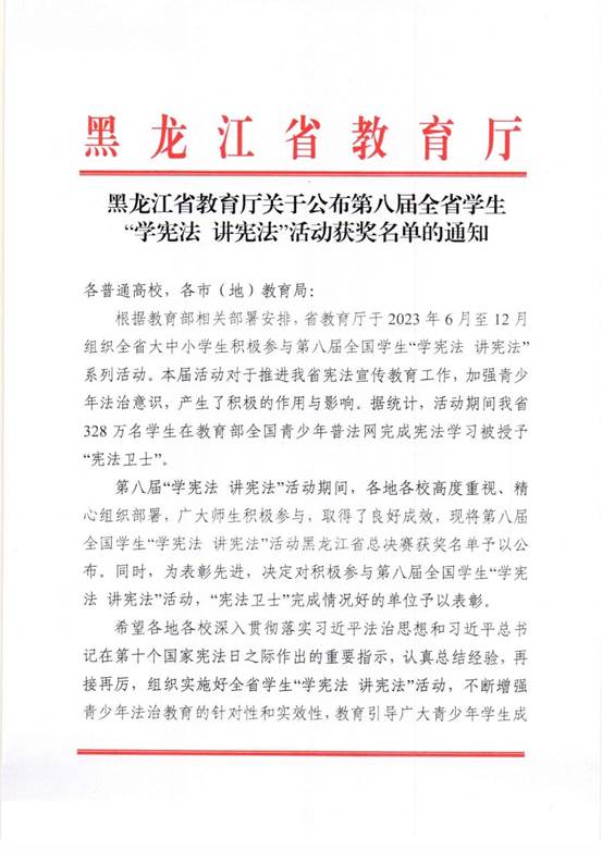 1月2日,我校在黑龙江省教育厅举办的第八届全省学生“学宪法 讲宪法”活动中,喜获优秀组织奖。