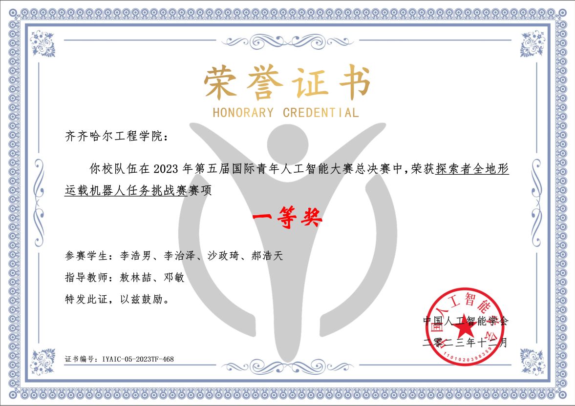 在近期举办的第五届国际青年人工智能大赛中,我校机电工程系汽车服务工程专业学生李浩男、文绍达、徐芝勇、李治泽等8名同学组建的两支队伍表现出色,分别斩获探索者全地形运载机器人任务挑战赛总决赛一等奖、二等奖。
