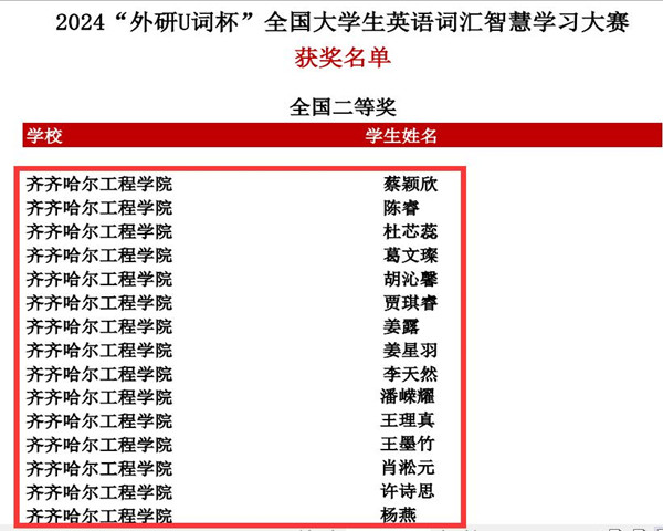 词海扬帆,智慧领航。近日,由外语教学与研究出版社主办的首届“外研U词杯”全国大学生英语词汇智慧学习大赛落下帷幕,经过竞赛激烈的角逐,我校共56名学生取得优异成绩,甘倩菥、李爵、吴旭鹏3人荣获比赛一等奖;蔡颖欣、陈睿等15名学生荣获比赛二等奖;曾文强、段宏达等38名学生荣获三等奖,获奖颇丰。