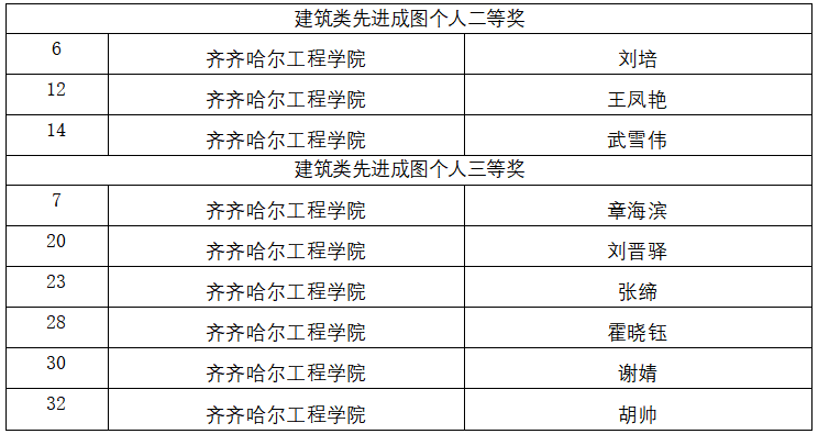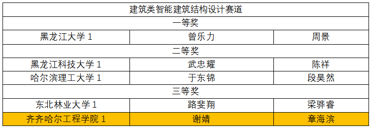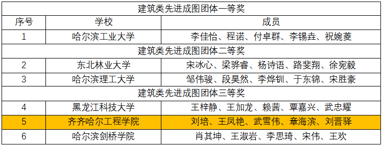 我校建筑工程系代表队的刘培、王凤艳、武雪伟在先进成图技术赛道个人赛中荣获二等奖;章海滨、刘晋驿、张缔、霍晓钰、谢婧、胡帅等6人获三等奖。在智能建筑结构设计赛道中,章海滨、谢婧小组获三等奖;刘培、王凤艳、武雪伟、章海滨、刘晋驿荣获建筑类先进成图团体三等奖,其5人代表建筑代表队入围全国总决赛。