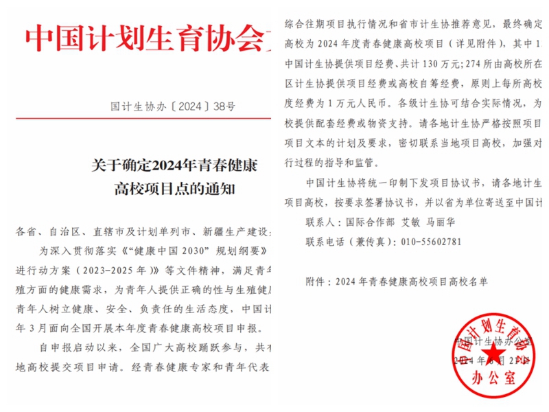 近日,中国计划生育协会发布《关于确定2024年青春健康高校项目点的通知》,学校团委申报的“以青春为浆,赴健康之约”青春健康项目在众多高校中脱颖而出,成功入选中国计划生育协会2024年全国高校青春健康项目,并提供专项经费支持。这是我校第1个全国大学生青春健康高校项目,此前的2020年,此项目我校已成功申报省级青春健康项目并结项。