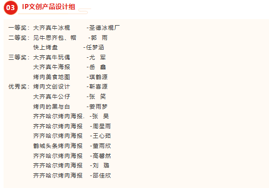 在收到大赛通知后,视觉传达设计专业积极组织学生参赛,经过初选后推荐上报,参赛学生的作品将齐齐哈尔烤肉的文化内涵与现代创意设计元素相结合,深度贴合了烤肉产业的特色和发展需求,并取得佳绩。