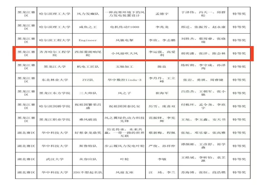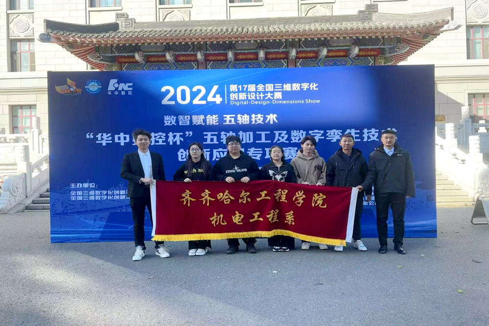 近日,第 17 届全国三维数字化创新设计大赛“华中数控杯”五轴加工及数字孪生技术创新应用专项赛(黑龙江赛区)传来喜讯,我校机械设计制造及其自动化专业学生胡奕潇、张洋、陈会林荣获特等奖(晋级国赛);刘展、王重阳、高月童团队荣获二等奖;何其润、刘麟松、尹云飞团队荣获二等奖;刘正杨、董思彤、周帅团队荣获二等奖的佳绩。